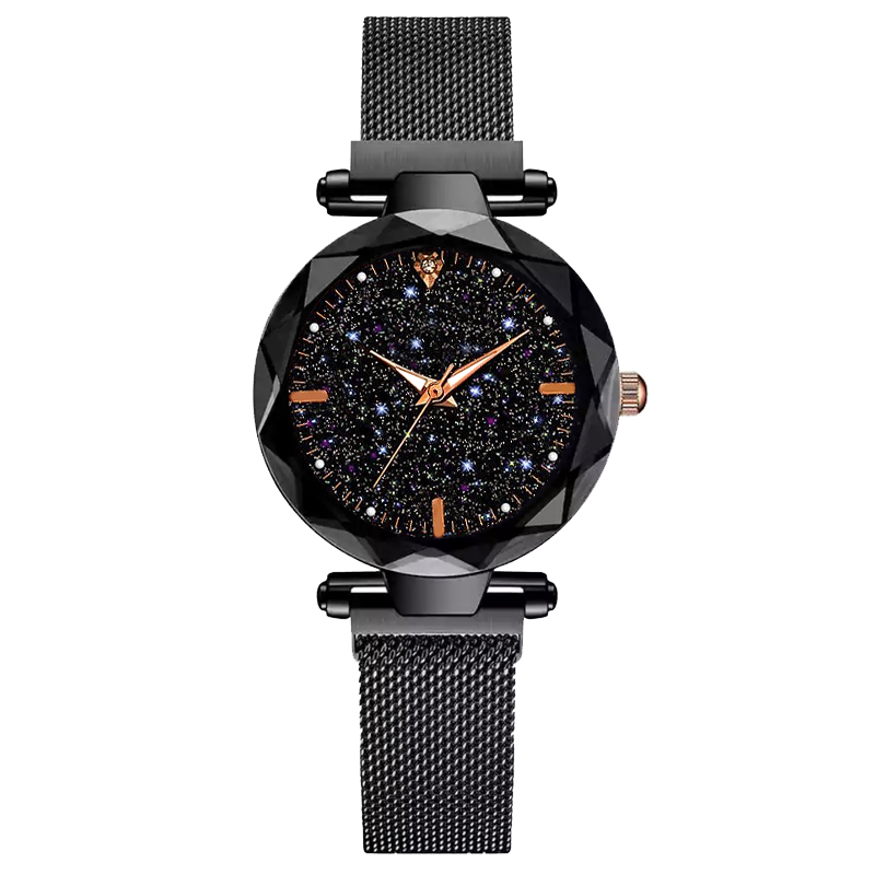 Черен дамски часовник със сияещ циферблат.